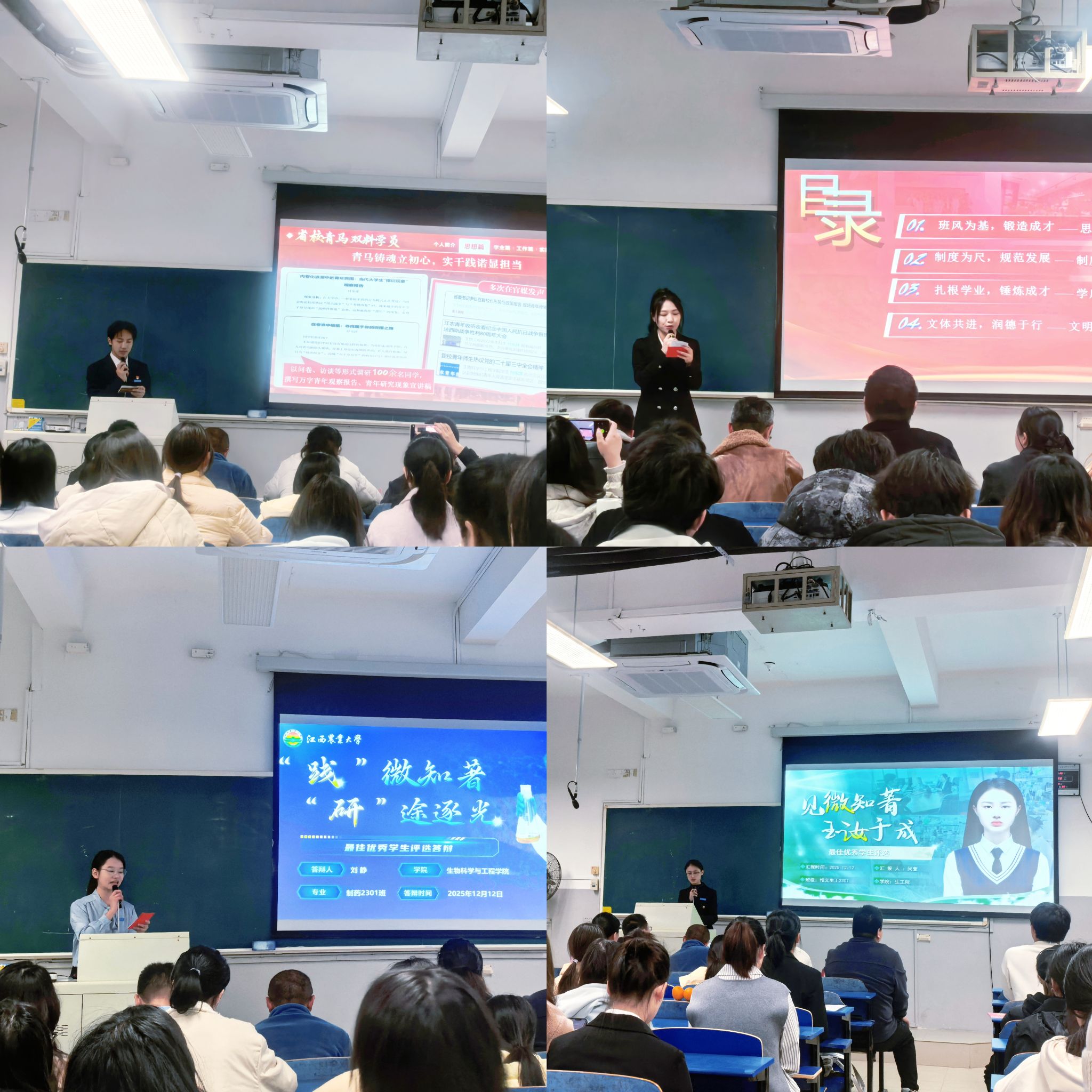 12月12日晚,江西农业大学2024-2025年度最佳优秀学生、最佳优秀学生干部、模范班集体答辩在2教举行,我院生工2201班付乐洋斩获2024-2025年度最佳优秀学生称号,惟义生工2201班荣获2024-2025年度模范班集体荣誉称号。这一佳绩不仅展现了生工学子昂扬向上的精神风貌,更深刻印证了我院“立德树人”根本任务的扎实推进与显著成效。