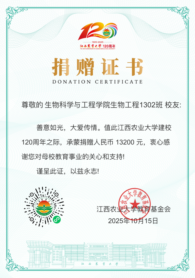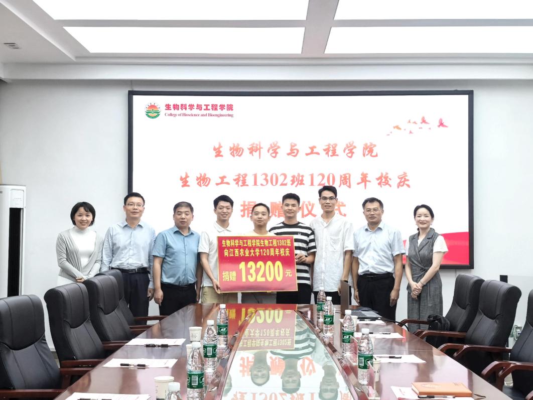 丹心育桃李,情深系母校。值江西农业大学建校120周年之际,我院生工1302班校友集体捐赠人民币13200元。10月14日,生工1302班120周年校庆捐赠仪式顺利举行。院党委书记、生工1302班班主任张庆华,院长王义华,党委副书记王莲花,党委委员孔令保等出席活动,校友代表、辅导员、校庆筹备工作人员等参加。会议由王莲花主持。
