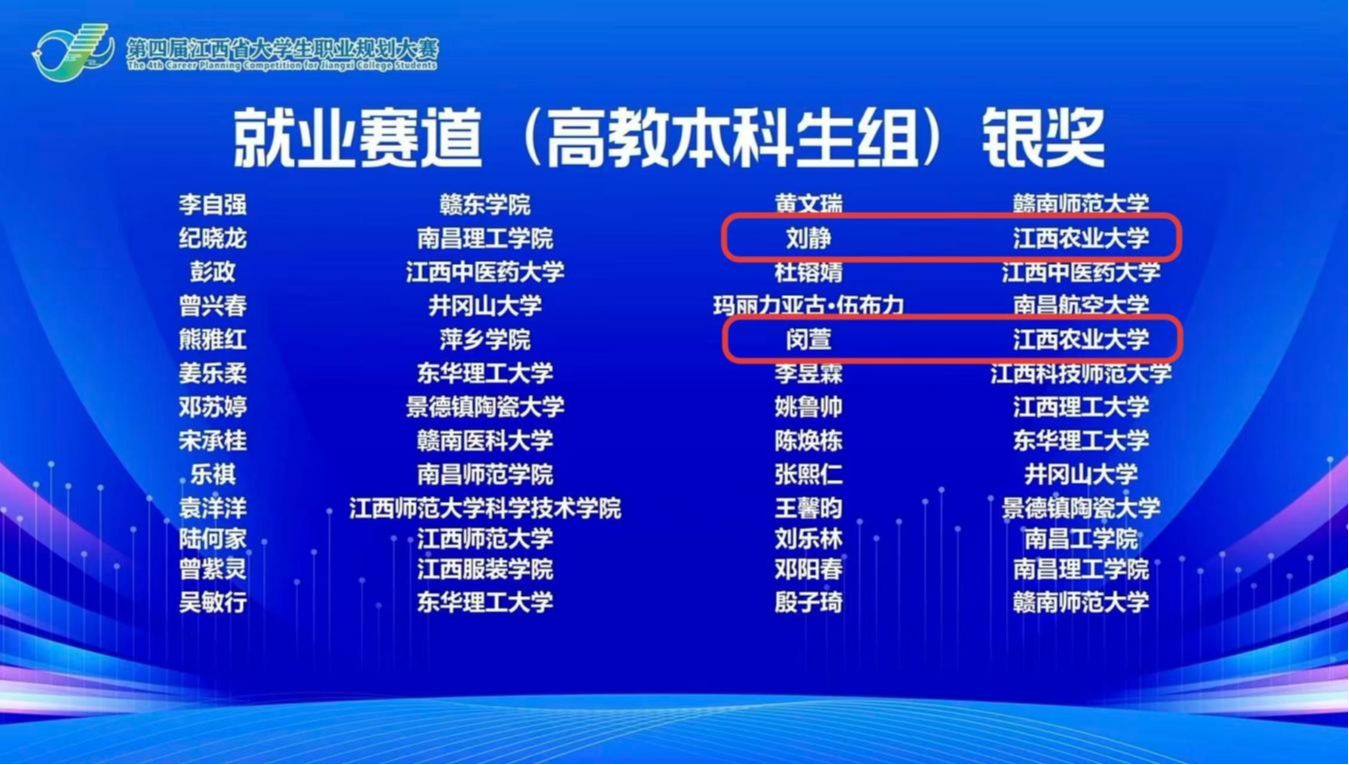 近日,第四届江西省大学生职业规划大赛在南昌大学圆满落幕。我院惟义生工2301班闵萱、制药2301班刘静两位同学凭借精心的准备与出色的表现,在全省86万余名参赛选手中脱颖而出,双双斩获就业赛道高教本科生组银奖,创下我校在该赛道的历史最好成绩。